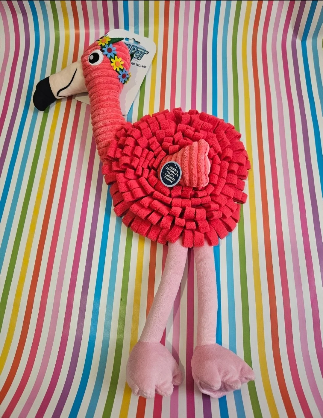 The Flamingo snuffle mat has lots of felt loops for hiding treats for your pets enrichment and play, crinkle material and a squeaker for extra fun and stimulation!